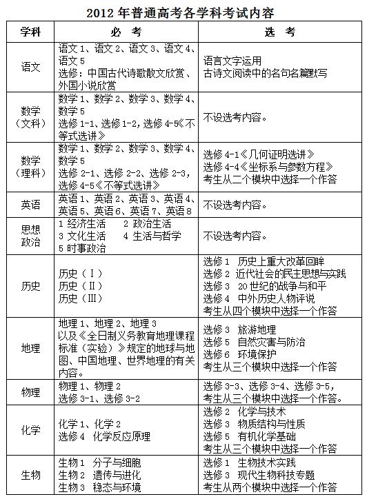 普通高等学校招生统一考试各科目考试范围